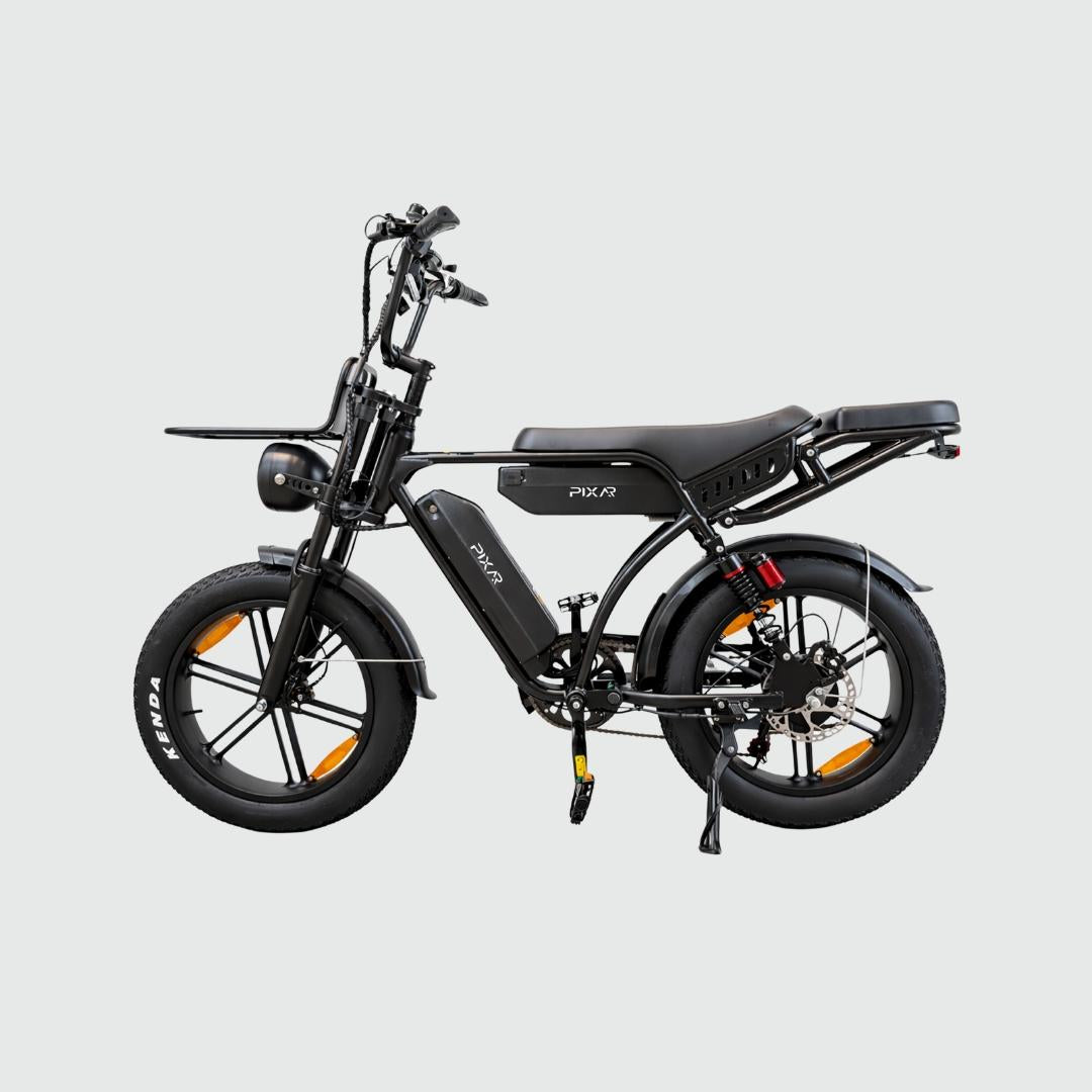 The Pixar M9 Electric Bike is a premium urban utility e-bike designed for comfort, performance, and everyday practicality. Built with a high-quality steel alloy frame and equipped with a dual suspension system (front & rear), it delivers a smooth and stable ride across city streets and rougher terrain. Powered by a 48V 250W high-speed brushless motor, the M9 offers efficient performance while maintaining full compliance with EU road regulations. With a long-range battery system (up to 130KM), it’s ideal for commuting, delivery use, or extended weekend rides.